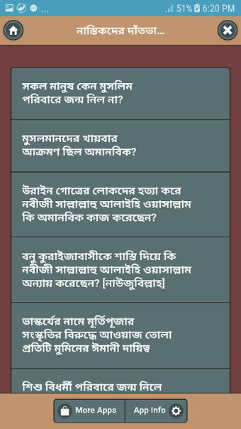 De applicatie "নাস্তিকদের দাঁতভাঙ্গা জবাব" biedt gebruikers een diepgaande verkenning van filosofische vragen die vaak worden gesteld door atheïsten. Deze app is gericht op educatie en verwijst naar argumenten en vragen die in de filosofie worden besproken, met als doel de gebruikers te helpen kritisch na te denken over het bestaan van God en de vele perspectieven die hierop bestaan. Het bevat honderden vragen die studenten kunnen tegenkomen en biedt een platform voor reflectie en discussie.